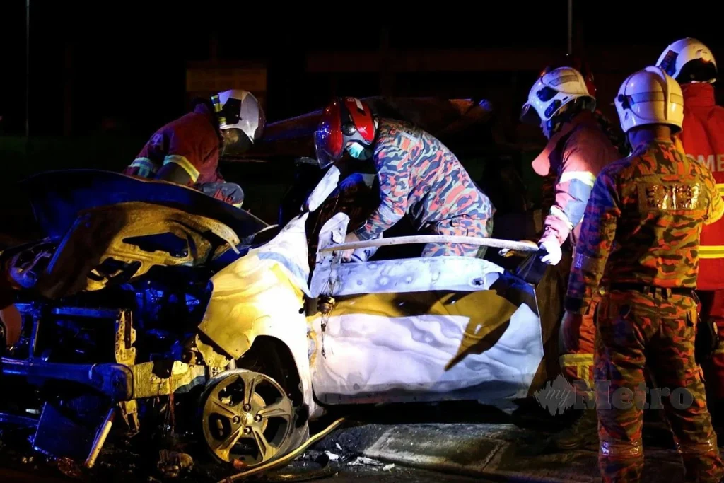 Dalam kejadian kira-kira jam 2 pagi itu, identiti kedua-dua mangsa di dalam kereta Perodua Axia yang musnah terbakar masih belum dikenal pasti.