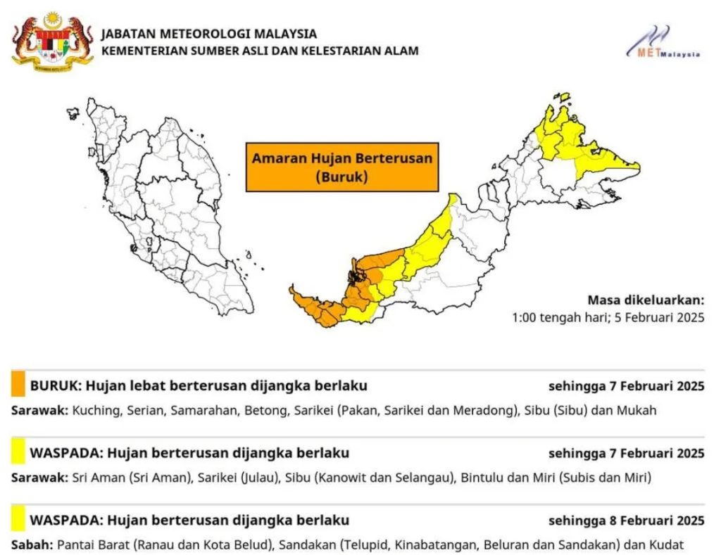 Hujan lebat berterusan juga dijangka berlaku di negeri Sarawak bagi tahap buruk dan waspada beberapa kawasan di negeri itu sehingga esok. – SABAH MEDIA
