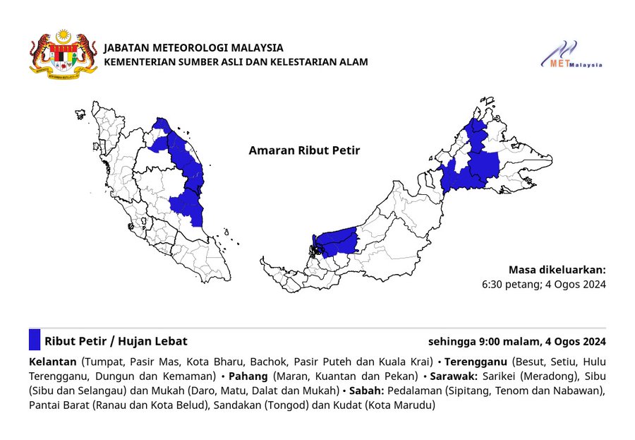 Jabatan Meteorologi Malaysia (METMalaysia) dalam hantaran memaklumkan di negeri Sabah ia membabitkan kawasan Pedalaman (Sipitang, Tenom dan Nabawan), Pantai Barat (Ranau dan Kota Belud), Sandakan (Tongod) dan Kudat (Kota Marudu),” kata METMalaysia dalam hantaran pada akaun Facebook.