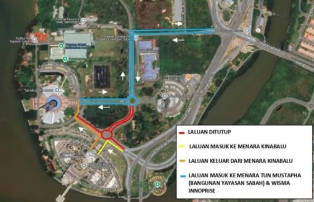 “Laluan keluar/masuk ke Menara Kinabalu akan dikawal oleh Polis DiRaja Malaysia (PDRM), manakala laluan keluar/masuk ke Menara Tun Mustapha (Bangunan Yayasan Sabah) dan Wisma Innoprise akan menggunakan laluan alternatif seperti peta di bawah.
