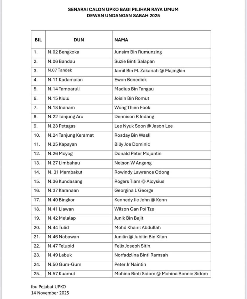 Berikut adalah senerai penuh calon calon UPKO.:-