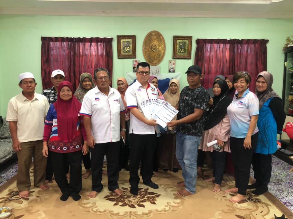 Ketua Bahagian UPKO Libaran, Dr Peter Jr Naintin, menerima borang keahlian tersebut daripada penaja Cawangan UPKO Kg Sinar Harapan, Abdul Sani Ibrahim, bersama-sama penduduk kampung.